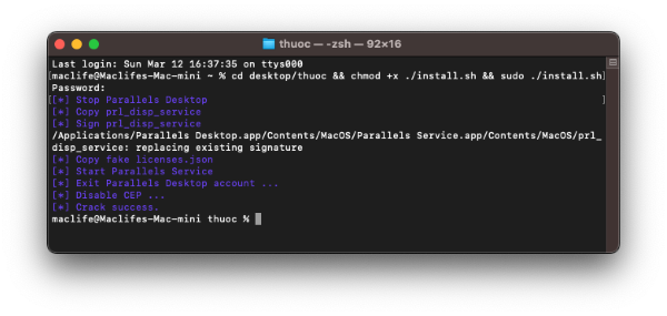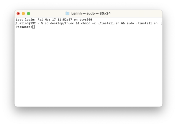 Bước 8: Mở Terminal và nhập lệnh sau: cd desktop/thuoc && chmod +x ./install.sh && sudo ./install.sh