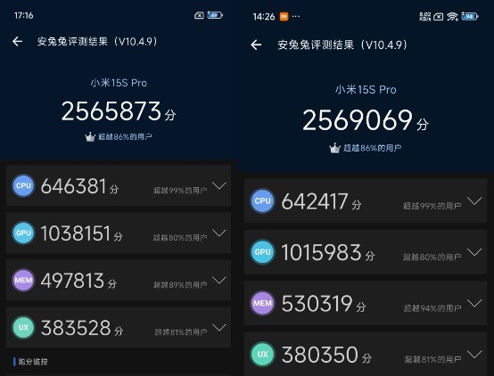 Kết quả chấm điểm hiệu năng của Xiaomi 15s Pro trên Geekbench 6 cho thấy nó có thể đạt 2.983 điểm đơn nhân và 9.251 điểm đa nhân. Ở phần mềm Antutu, thiết bị đạt điểm số vô cùng ấn tượng là 2.569.069 điểm. Dù điểm số này chỉ là trên lý thuyết tuy nhiên cũng phần nào khẳng định được sức mạnh của chip Xring O1.