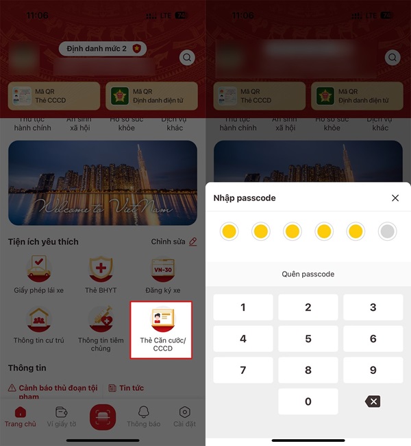 Trước hết, bạn hãy mở ứng dụng VneID trên điện thoại và nhấn chọn mục Thẻ căn cước/CCCD. Sau đó, hãy nhập mật khẩu để có thể truy cập vào Căn cước công dân điện tử.