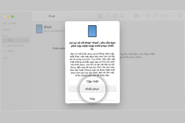 - Bước 4: Khôi phục iPad bằng cách truy cập vào tìm thiết bị trong Finder hoặc iTunes trên máy tính đã kết nối trước đó. Chọn “Restore” khi được nhắc và đợi máy vi tính tải phần mềm cho iPad và hoàn tất quá trình khôi phục. Sau đó ngắt kết nối và tùy chỉnh thiết lập iPad theo mong muốn.