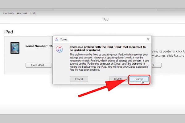 Lưu ý, khi bạn chọn “Restore”, iTunes sẽ tải và cài đặt phiên bản phần mềm thế hệ mới nhất tương thích cho iPad, đồng thời xóa toàn bộ dữ liệu hiện có trên thiết bị. Đảm bảo rằng bạn đã chuẩn bị sẵn sàng cho việc mất dữ liệu trước khi thực hiện thao tác này.