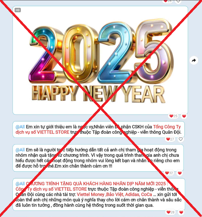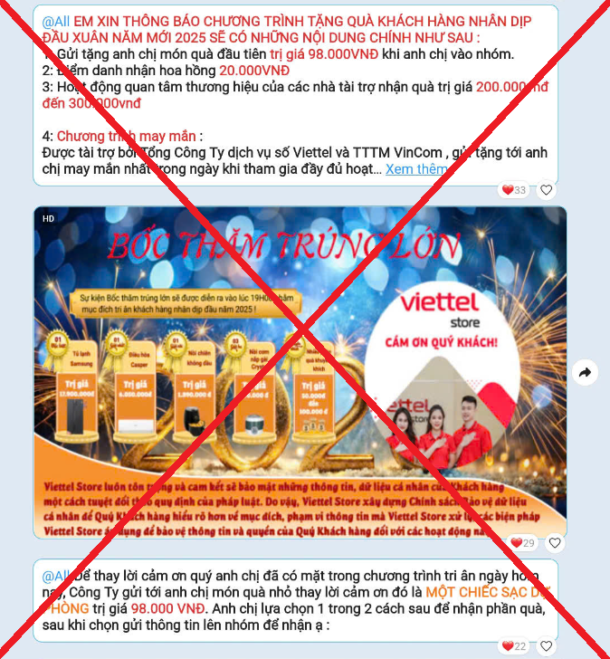 Lợi dụng thời điểm Tết nguyên đán 2025, trên mạng xã hội xuất hiện một số tổ chức/cá nhân giả danh nhân viên Viettel Store mời chào các dịch vụ tặng quà Dịp Tết như tặng đồ gia dụng, sạc dự phòng, ấm siêu tốc… và mời chào tham gia chương trình bốc thăm trúng thưởng không đúng với các hình thức khuyến mại hiện hành tại Viettel Store.