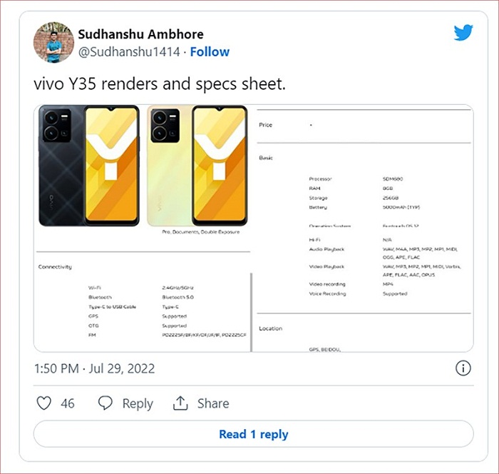 Trước đó, Vivo Y35 đã được phát hiện trên nhiều trang web chứng nhận với mã số model V2250 như Indonesia Telecom, Geekbench, TKDN và EEC. Mới đây, chuyên gia Sudhanshu đã bất ngờ tiết lộ hình ảnh render cũng như cấu hình chi tiết của Vivo Y35 trước thềm ra mắt.