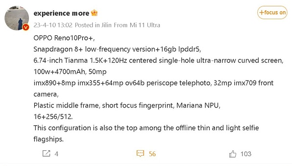 Lộ diện cấu hình chi tiết OPPO Reno 10 Pro+