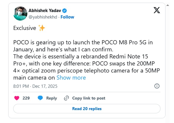 Dựa trên những tin đồn xuất hiện gần đây, leaker Abhishek Yadav cho biết POCO M8 Pro 5G sẽ không ra mắt ngay trong năm nay mà dời sang năm sau. Đáng chú ý, thiết bị này thực chất là phiên bản đổi tên của Redmi Note 15 Pro Plus – mẫu điện thoại đã được Xiaomi giới thiệu tại thị trường Trung Quốc. Điều này cũng đồng nghĩa với việc cấu hình của Xiaomi POCO M8 Pro 5G sẽ thừa hưởng nhiều điểm mạnh từ người “anh em” Redmi.