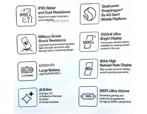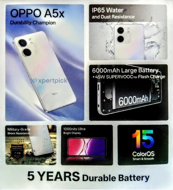 Theo các tài liệu quảng cáo vừa bị rò rỉ, OPPO A5x được trang bị chip Snapdragon 6s Gen 1, mang đến hiệu năng ổn định và tiết kiệm năng lượng. Màn hình với độ sáng lên đến 1.000 nits và tần số làm mới 90Hz hứa hẹn mang lại trải nghiệm hình ảnh mượt mà, thích hợp cho việc xem video hoặc lướt web.