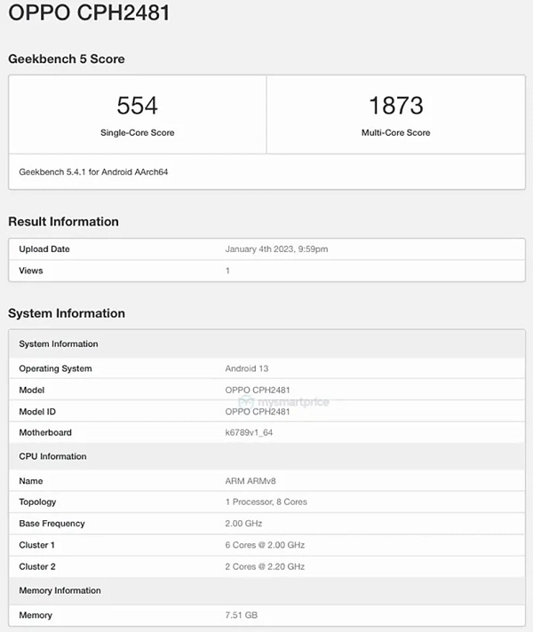 Gần đây, một số báo cáo đã hé lộ rằng dòng điện thoại OPPO Reno 8T 4G sắp trình làng sẽ có số model là CPH2481. Đồng thời, thiết bị tương tự cũng xuất hiện trên trang web đo hiệu năng Geekbench. Theo đó, cấu hình OPPO Reno 8T 4G lộ diện cho thấy sản phẩm sẽ được trang bị con chip MediaTek Helio G99 8 nhân, đi kèm dung lượng RAM tối đa 8GB và chạy hệ điều hành Android 13.