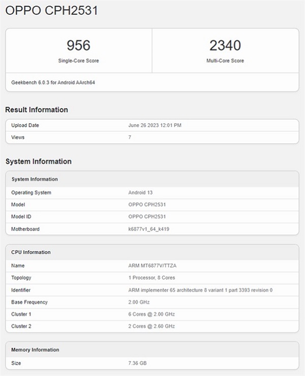 Về vi xử lý, dự kiến OPPO sẽ trang bị cho Reno10 5G con chip Dimensity 7050 nhà MediaTek hứa hẹn đem đến hiệu năng vô cùng ấn tượng. Ngoài ra đi kèm theo máy còn có RAM tối đa 12GB và bộ nhớ trong 512GB. Trong một báo cáo mới nhất, hiệu năng của Reno10 5G đã được tìm thấy trên cơ sở dữ liệu Geekbench. Máy đạt 2.340 điểm đa nhân và 956 điểm đơn nhân.