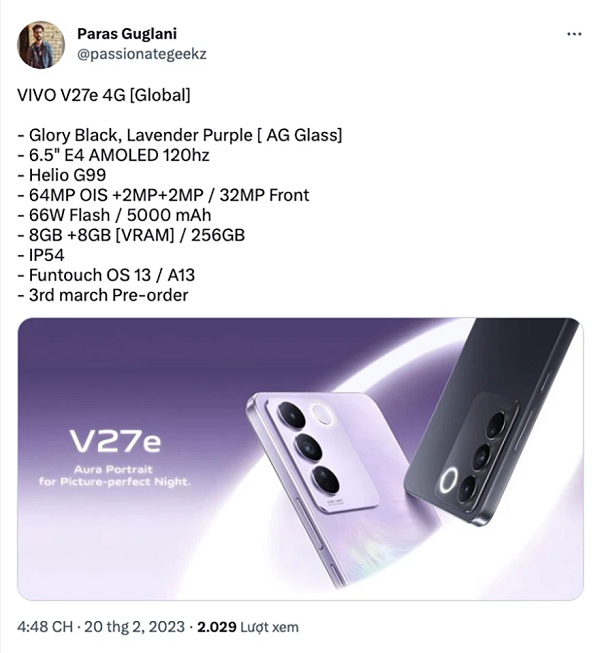 Dự kiến, Vivo sẽ chính thức giới thiệu dòng Vivo V27 vào ngày 1/3 tới đây tại thị trường Ấn Độ, gồm các model V27, V27 Pro và V27e. Tuy nhiên, mới đây leaker Paras Guglani đã chia sẻ gần như toàn bộ cấu hình Vivo V27e.
