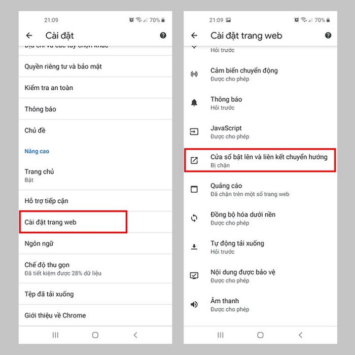 Bước 2: Cửa sổ mới hiện lên, bạn mở Cài đặt trang web/ chọn cửa sổ bật lên và liên kết chuyển hướng.