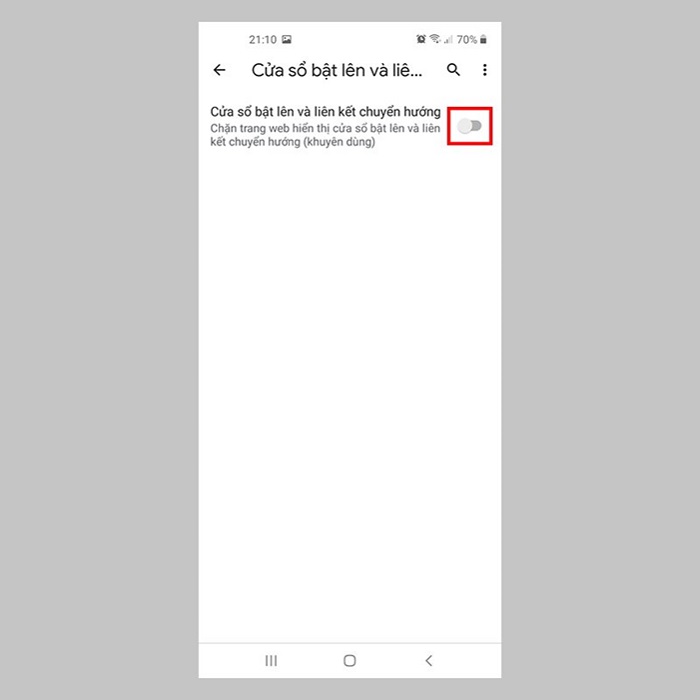 Bước 3: Trong bước 3 của cách chặn quảng cáo trên Google Chrome cho Android, bạn chuyển thanh gạt ngang về phía bên trái để tắt cửa sổ Pop – up.