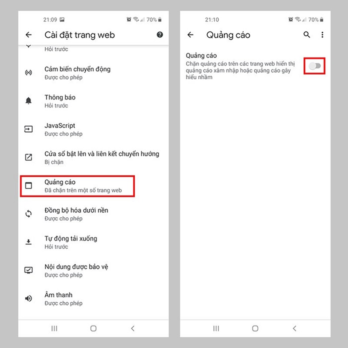Bước 4: Sau đó bạn quay về giao diện Cài đặt trang web rồi chọn Quảng cáo/ chuyển thanh gạt ngang về phía bên trái để tắt quảng cáo.