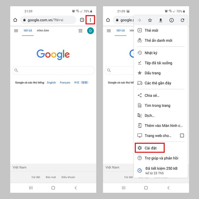 Bước 1: Mở ứng dụng Google Chrome/ sau đó chọn dấu ba chấm góc trên bên phải của màn hình/ Chọn Cài đặt.