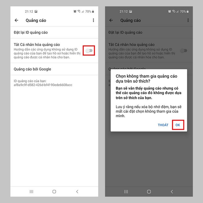 Bước 3: Ở bước này, bạn tắt mục “tắt cá nhân hóa quảng cáo”, sau đó chuyển thanh gạt sang bên phải để mở tính năng này, sau đó chọn OK.