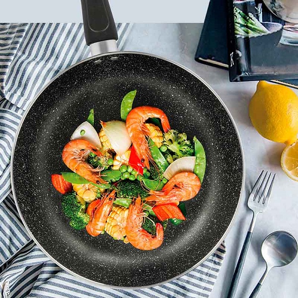 - Chảo phủ vân đá: Loại chảo có trọng lượng không quá nặng, có đáy được làm bằng nhôm hoặc inox, chảo bắt từ và bề mặt được phủ một lớp vân đá giúp gia tăng tính thẩm mỹ.
