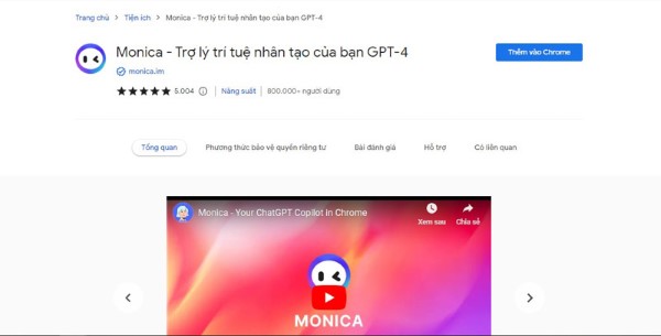 Nhấp vào tiện ích “Monica – Trợ lý trí tuệ nhân tạo của bạn GPT-4” > Nhấp vào nút “Thêm vào Chrome” > Xác nhận cài đặt bằng cách nhấp vào “Thêm tiện ích”.