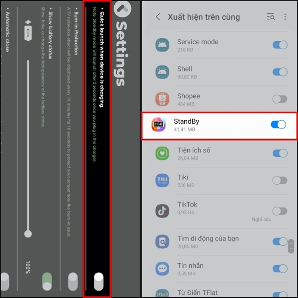 Bước 4: Tại mục Cài đặt ứng dụng, bạn chọn Quick launch when device is charging để bắt đầu khởi chạy ứng dụng khi máy đang sạc pin. Sau đó, điện thoại sẽ chuyển sang trang Xuất hiện trên cùng, bạn chọn mục Tìm và cấp quyền xuất hiện trên cùng cho ứng dụng Standby iOS. Người dùng cũng có thể cấp quyền Xuất hiện trên cùng tại phần thông tin ứng dụng.