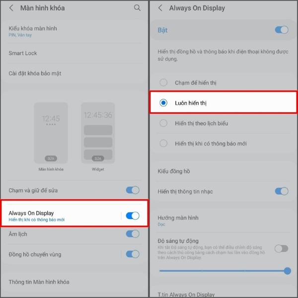 Bước 5: Cuối cùng, bạn nhấn vào mục Cài đặt > chọn Màn hình khóa. Tại mục màn hình khóa > bạn tiến hành cấp quyền cho chế độ Always On Display > chọn Luôn hiển thị.