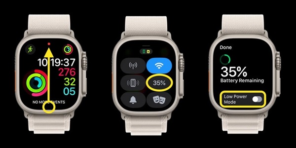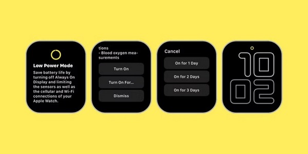 Khi kích hoạt tính năng tiết kiệm pin, thông báo sẽ xuất hiện trên màn hình, đồng thời bạn sẽ nhìn thấy một vòng tròn màu vàng phía trên cùng của mặt đồng hồ. Ngoài ra, phần trăm pin cũng chuyển sang màu vàng trong trung tâm điều khiển và khi đồng hồ sạc thì vòng tròn sạc sẽ chuyển từ màu xanh lá cây sang màu vàng.