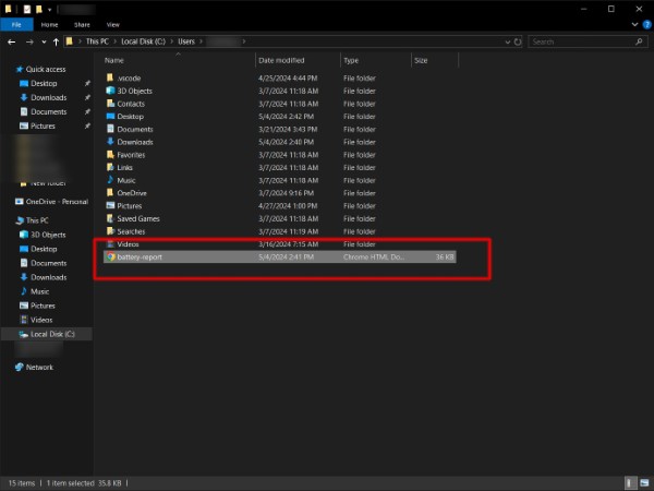 Bước 3: Truy cập đường dẫn: C:\Users\[Tên người dùng]\battery-report.html