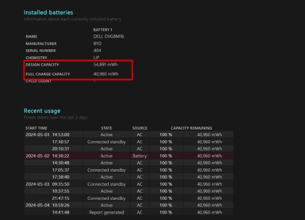 Hiệu số giữa hai chỉ số này phản ánh mức độ chai pin. Ví dụ, nếu pin có Design Capacity là 50.000 mWh nhưng chỉ còn Full Charge Capacity 35.000 mWh, thì mức độ chai là 15.000 mWh – tương đương 30%.