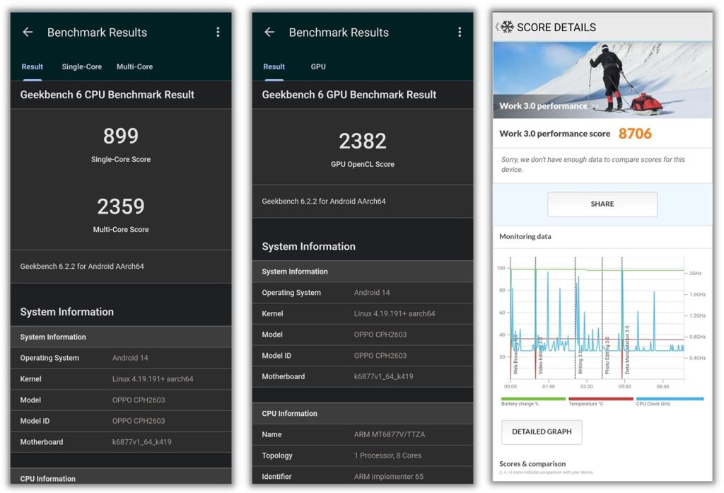 Qua bài test chấm điểm hiệu năng của chip Dimensity 7050 5G trên OPPO Reno11 F 5G với một số phần mềm chuyên dụng như GeekBench 6, 3DMark và PCMark, kết quả như sau. Cụ thể: