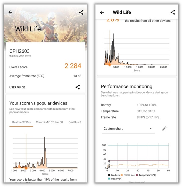 Với bài test đồ họa nhẹ 3DMark Wild Life, OPPO Reno11 F 5G đạt điểm tổng là 2.284 điểm và FPS trung bình 13.68. Trong quá trình chấm điểm, thời lượng pin và nhiệt độ máy hầu như không thay đổi sau khi hoàn thành bài test (vẫn giữ nguyên ở mức 100% pin và 34 độ C).