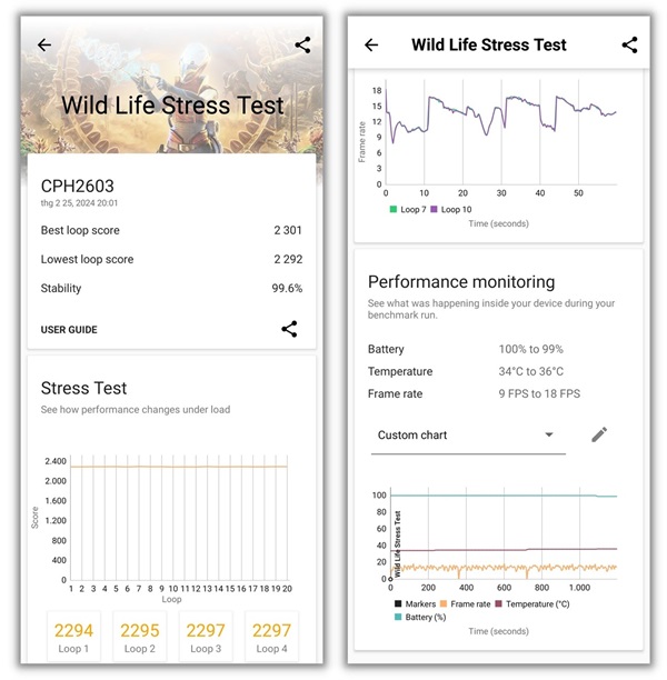 Cuối cùng là bài test 3DMark Wild Life Stress Test nặng nhất, kết quả cho thấy OPPO Reno11 F 5G có độ ổn định tới 99.6%, con số này cực ấn tượng và vượt trội hơn nhiều sản phẩm khác cùng phân khúc. Đồng thời, pin của máy chỉ giảm nhẹ 1% và nhiệt độ tăng 2 độ C sau khi hoàn thành bài kiểm tra.