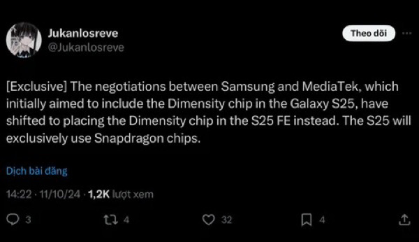 Con chip nội bộ Exynos 2500 do Samsung tự sản xuất không đáp ứng được hiệu suất đã khiến hãng cân nhắc lựa chọn dòng chip Dimensity hoặc Snapdragon đồng nhất trên toàn bộ thị trường. Trước đó, nhiều nguồn tin cho biết hãng đang xem xét việc trang bị chip MediaTek Dimensity 9400 trên dòng Galaxy S25 với hai phiên bản là S25 và S25 Plus. Tuy vậy, một nguồn tin rò rỉ mới đây từ leaker Jukanlosreve cho thấy Samsung sẽ chỉ sử dụng con chip cho phiên bản Galaxy S25 FE, trong khi đó các phiên bản còn lại sẽ chạy chip Snapdragon 8 Gen 4 trên tất cả các thị trường.