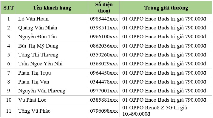 – 01 giải đặc biệt, 01 OPPO Reno8 Z 5G trị giá hơn 10.000.000đ