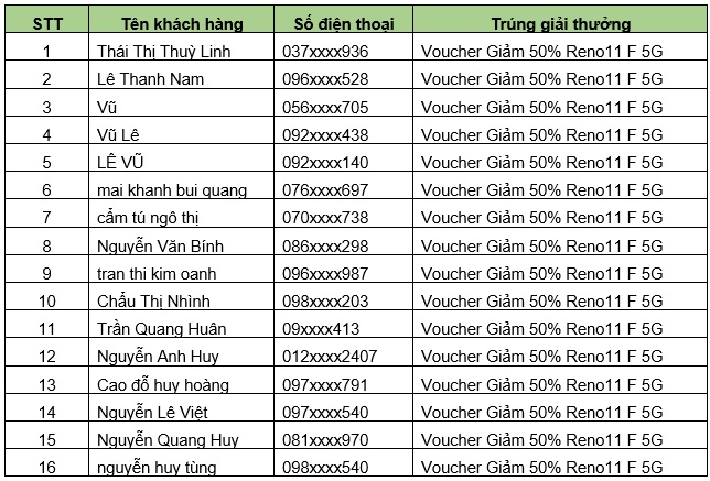 Danh sách khách hàng trúng thưởng may mắn tham gia chương trình vòng quay may mắn: