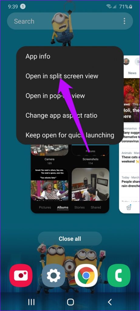 - Bước 2: Sau đó có một menu hiện ra, các bạn hãy nhấn vào “Open in split screen view”.