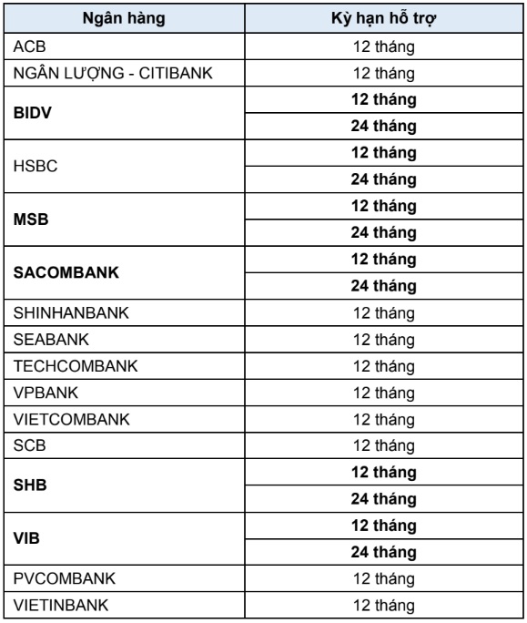 – Kỳ hạn hỗ trợ trả góp theo ngân hàng