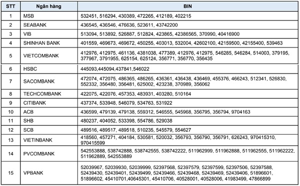 4. Các loại thẻ tín dụng bin 08 số của các ngân hàng thuộc danh sách sau được áp dụng chương trình (cập nhật ngày 30/07/2024)