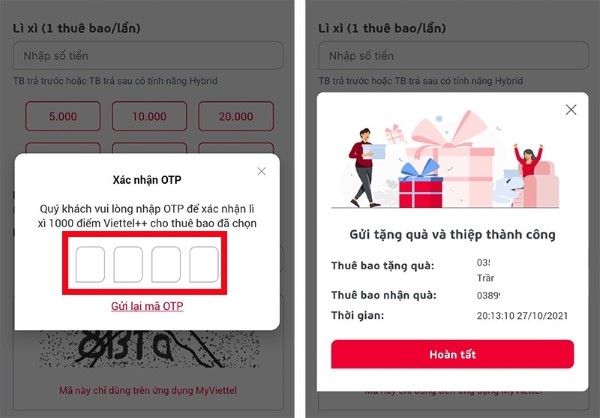 Một mã OTP sẽ được gửi về số thuê bao của bạn, nhập vào để hoàn tất quá trình tặng điểm.