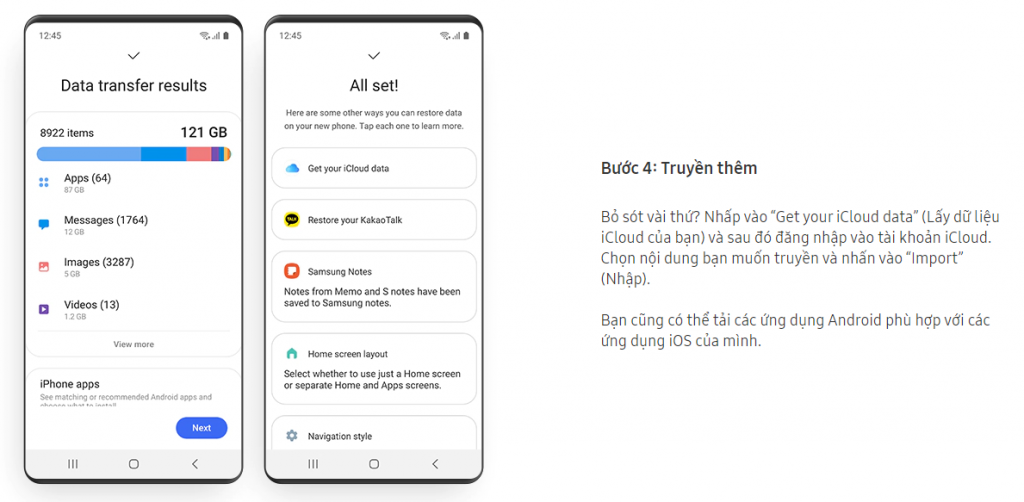 Bạn có thể di chuyển ảnh, video, danh bạ, sự kiện lịch, ghi chú và các tính năng khác từ iPhone hoặc iPad sang Galaxy. Bạn thậm chí có thể mang dữ liệu của mình từ iCloud.