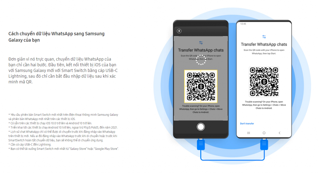 Lần đầu tiên trên bất kỳ thiết bị Android nào, bạn có thể truyền các trò chuyện trên WhatsApp và ảnh trên thiết bị iOS sang Samsung Galaxy mới. Chỉ với cáp USB C-Lightning, bạn có thể thoải mái tiếp tục lưu trữ tại nơi bạn đã lưu giữ tất cả dữ liệu phòng chat được di chuyển an toàn và sẵn sàng để sử dụng.