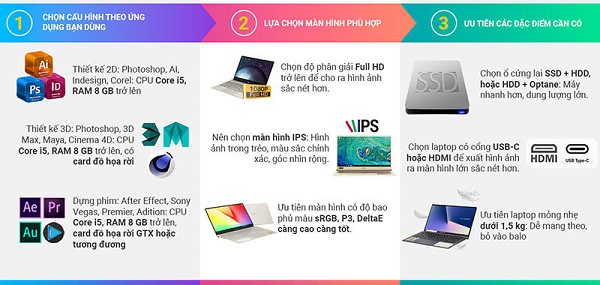 Để có thể đáp ứng được nhu cầu về thiết kế đồ họa, Laptop thiết kế cần phải sở hữu một cấu hình cao, đặc biệt là về mặt màu sắc hiển thị. Các dòng máy tính có cấu hình CPU Core i5 hoặc là i7, RAM sẽ từ 8GB, có card màn hình rời là một trong những sự chọn phù hợp để có thể chạy được mượt mà các phần mềm thiết kế.