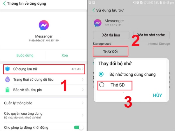 Bước 2: Nhấn chọn vào Sử dụng lưu trữ > chọn mục Thay đổi > chọn Thẻ nhớ SD để chuyển ứng dụng sang thẻ nhớ là xong.