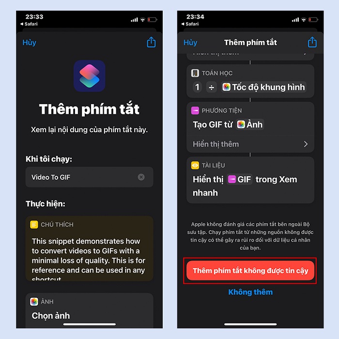 Bước 1: Click tại đây để tải nhanh phím tắt. Lúc này, màn hình sẽ chuyển sang ứng dụng Shortcuts trong trường hợp bạn đã cấp quyền truy cập cho phím tắt này. Sau đó kéo xuống và nhấn vào “Thêm phím tắt chưa được tin cậy”.