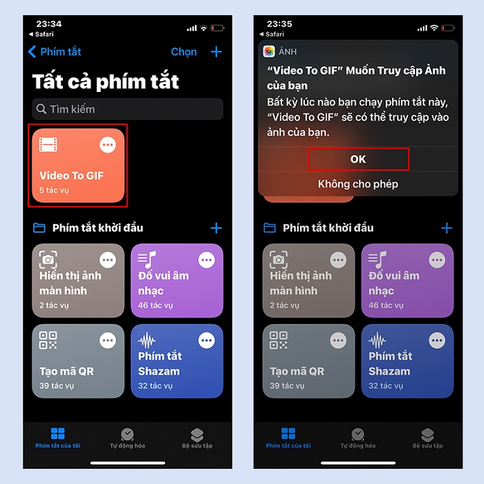 Bước 2: Khi đã thêm phím tắt thành công, bạn cần phải nhấn vào nó một lần nữa để cấp quyền truy cập vào kho hình ảnh và video. Click Ok để tiếp tục.