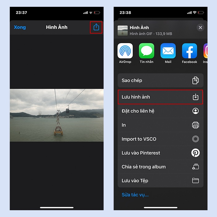Bước 4: Sau khi đã chuyển đổi xong sẽ xuất hiện một bản xem trước. Nếu như hài lòng với sản phẩm vừa tạo, bạn nhấn vào kí hiệu chia sẻ ở góc màn hình. Lúc này, bạn có thể lưu lại ảnh vào iPhone hoặc chia sẻ qua email, tin nhắn,…