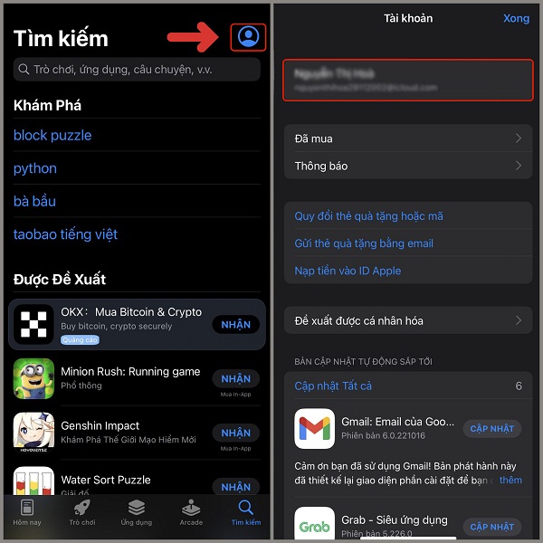 Để chuyển vùng Appstore cho iPhone sang Mỹ, trước hết, bạn hãy truy cập vào Appstore trên điện thoại, rồi bấm vào biểu tượng Cá nhân ở góc trên bên phải màn hình. Sau đó chọn tên tài khoản iCloud.