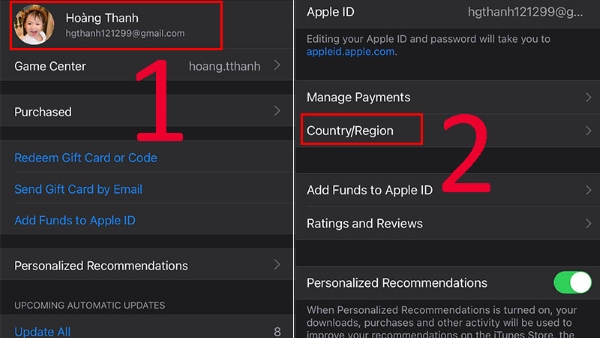 Bước 2: Nhấn chọn tên tài khoản ID Apple để đăng nhập và chọn mục Quốc gia/Vùng (Country/Region).
