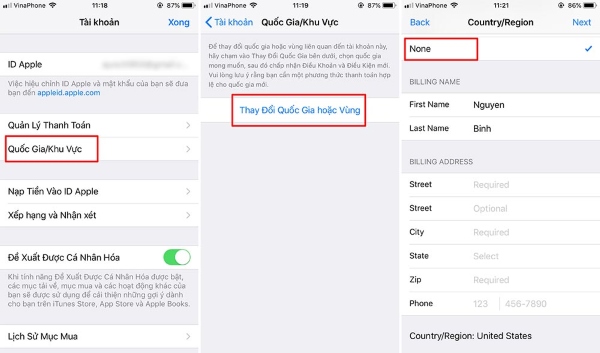 Bước 3: Chọn mục Change Country or Region >> chọn tiếp mục Quốc gia/ Vùng >> chọn quốc gia là Việt Nam.
