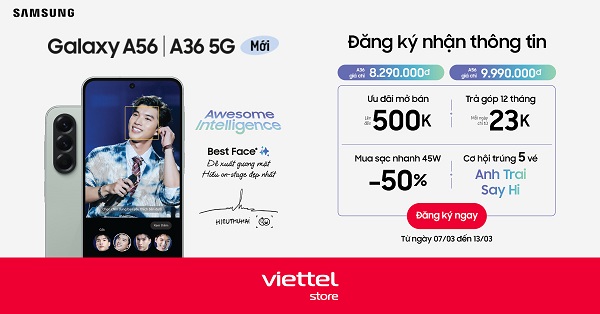 Galaxy A36 và Galaxy A56 5G sẽ được mở bán chính thức vào ngày 14/03 tại hệ thống các siêu thị Viettel Store với các ưu đãi hấp dẫn: