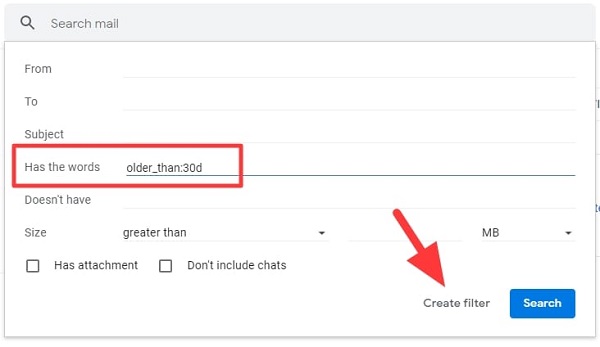 Bước 4: Trên hộp bật lên, bạn sẽ nhập vào phần “old_than: X”. Dấu X trên lệnh này sẽ là khung thời gian mà bạn muốn xóa các tin nhắn cũ. Theo lệnh sẽlà “d” trong ngày, “w” trong tuần, “m” trong tháng và “y” sẽ là trong năm. Chẳng hạn như, nếu bạn muốn khung thời gian đó là bốn năm, bạn sẽ phải thay đổi X thành 4y . Sau đó, bạn chọn Tạo bộ lọc .