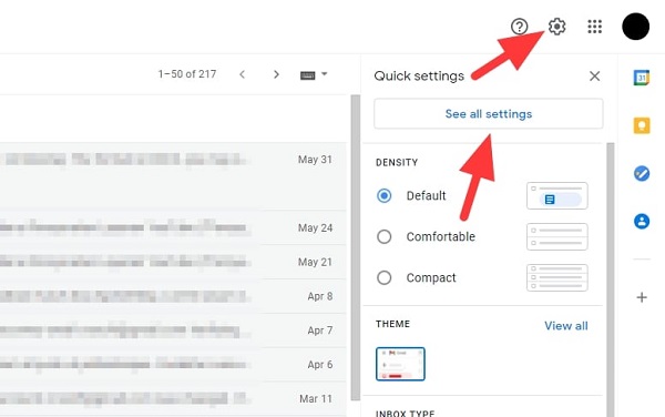 Bước 2: Tại hộp thư đến Gmail, phía bên phải của màn hình bạn nhấp vào biểu tượng “Cài đặt”. Tiếp theo, bạn nhấn chọn “Xem tất cả cài đặt”(See all settings).