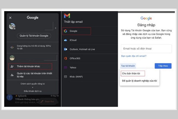 Bước 1: Mở ứng dụng Gmail đã được cài sẵn trên thiết bị >> Bấm chọn logo của Gmail>> Nhấn nút “Thêm tài khoản”.