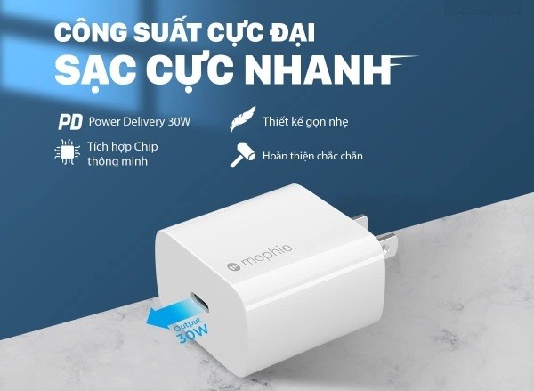 Mophie nổi tiếng với các phụ kiện chất lượng cao và sản phẩm PD 30W GaN là minh chứng cho điều đó. Sử dụng công nghệ bán dẫn GaN giúp thu nhỏ kích thước củ sạc nhưng vẫn giữ hiệu suất mạnh mẽ. Củ sạc cung cấp công suất lên đến 30W, hỗ trợ sạc nhanh cho iPhone 13 lẫn iPad, MacBook Air. Đây là lựa chọn đáng giá nếu bạn ưu tiên hiệu suất và độ bền.